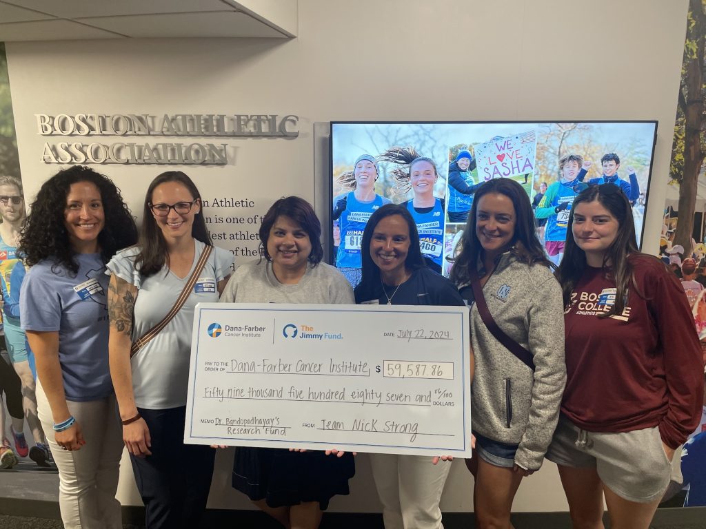 In November of last year, we had almost 40 runners take the starting line at the BAA Half Marathon. All of the money raised went directly to cancer research. We recently had the honor of presenting Dr. Bandopadhayay “Mimi” with a check for her research lab at Dana Farber for $59,587. It was truly amazing to see the direct impact of our fundraising.